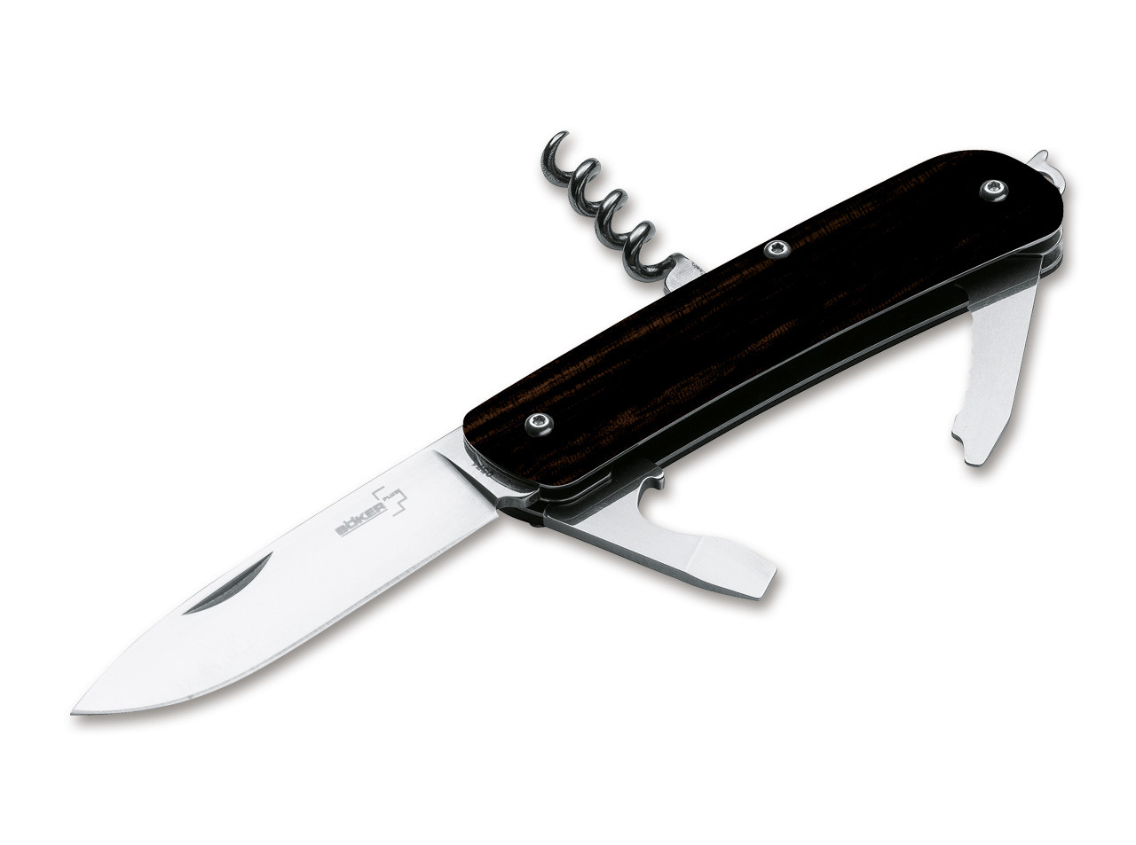 The history of the Boker Manufactory began in 1869 with the Boker sports knife, an ancestor of all modern multifunctional pocketknives. After almost 150 years of successful model history, it was time to take this traditional concept into the present. The modernized version is based on solid steel plates, which makes the knife extremely sturdy. Handle scales of premium ebony turn the rather technical Boker Plus Tech Tool into an elegant gentleman’s knife. The dark wood gives the knife an elegant, stylish appearance – perfect for being tucked into a suit pocket. It is equipped with a large blade (12C27) and the following tools (4Cr13): glass breaker, large screwdriver with bottle opener and wire bender/stripper, small serrated blade with screwdriver tip, foldout lanyard hole, corkscrew.