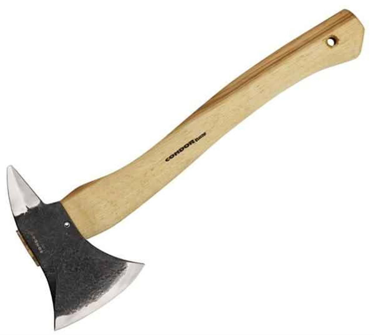 Condor Spike Axe. 16″ overall. 7″ cast 440 stainless axe head with 4 1/2″ cutting edge and spike. American hickory handle. Black leather belt sheath. Weight 3.5 pounds