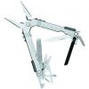 Needlenose pliers, wire cutter, wire crimper, serrated knife blade, Fiskars scissors, cross point screwdriver, small, medium and large flat blade screwdrivers, can opener, bottle opener.