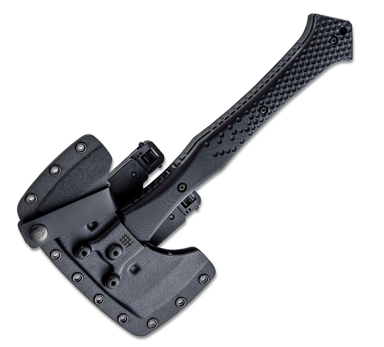 Halfbreed Blades Compact Battle Axe – Black CBA-01, 12.59″ Overall Black Teflon Coated K110 D2 Axe, Black G-10 Handle, Black Molded Kydex Sheath