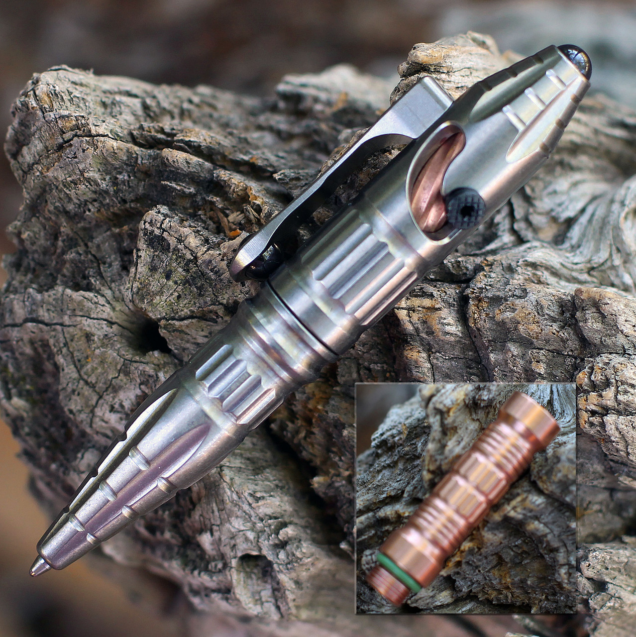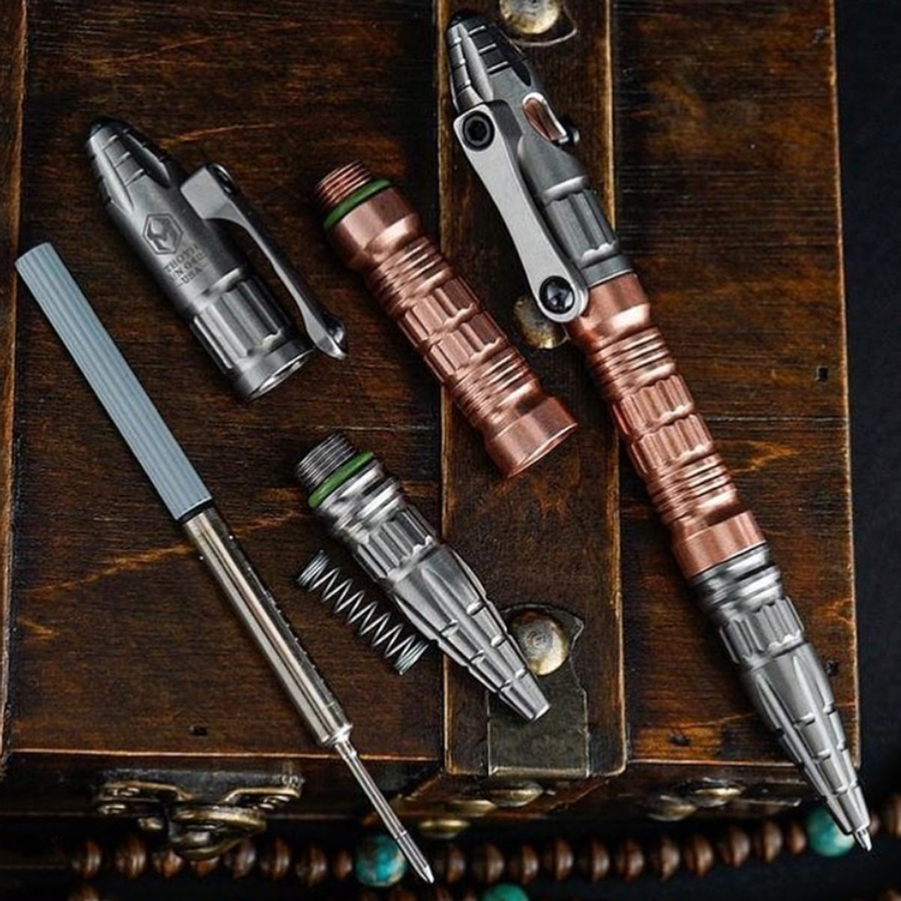 The Thoth is a completely modular, Titanium bolt-action pen from Heretic Knives designed to change configurations based of user needs. This tactical pen features a removable copper center section allowing users to choose between a larger 5.2″ full-length configuration or a more compact 3.48″ ‘Chub’ size for the ultimate discrete carry piece. The Thoth titanium bolt-action pen blends tactical function and modern design with an attractive stonewashed finished on the main body, a copper bolt, and a copper cartridge extension. As these custom pens age, the copper with naturally patina developing warmth and character overtime adding to their natural charm. With the Heretic Thoth pen, you have two uniquely stylish tactical bolt-action pens rolled into one!