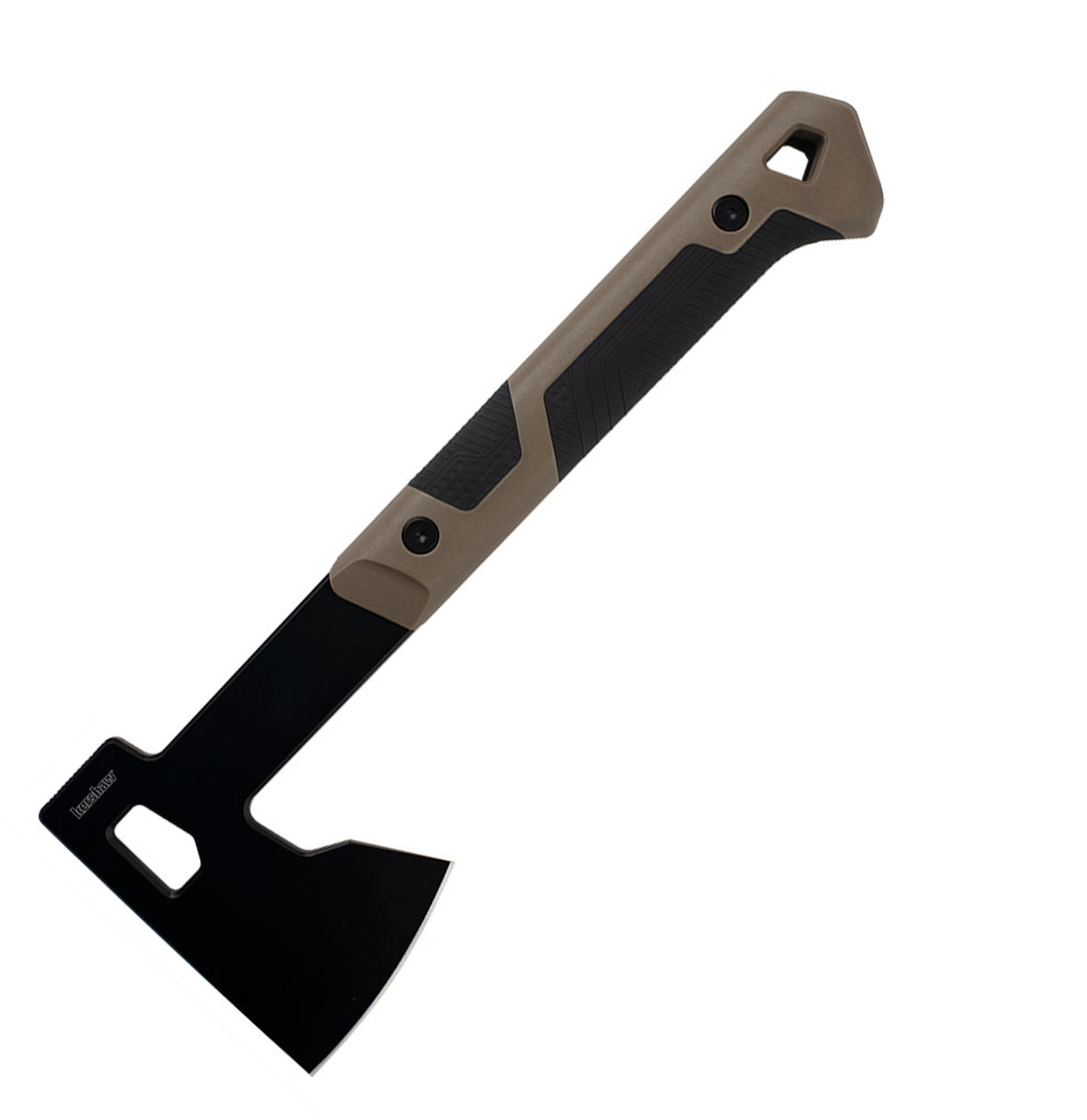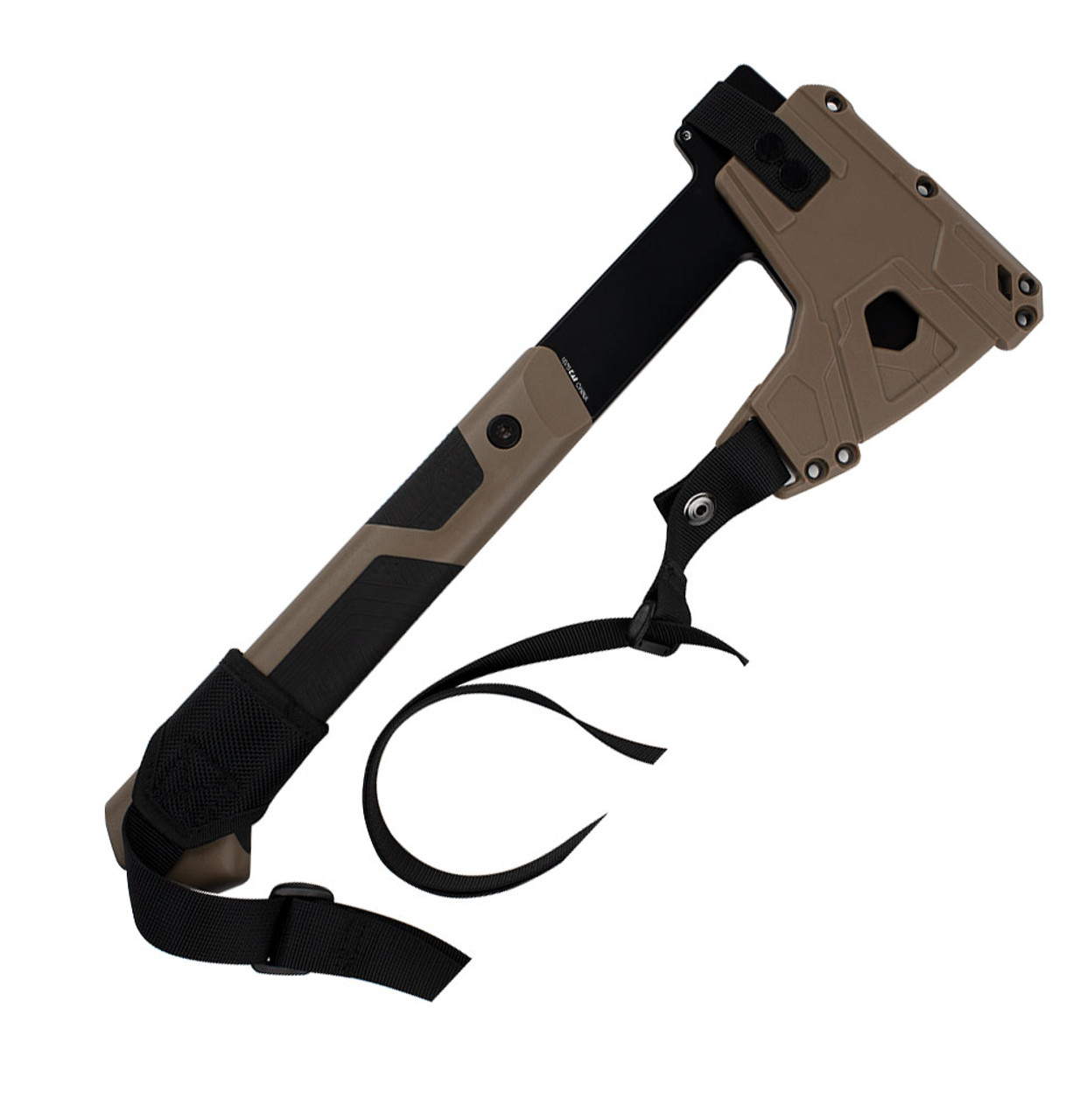 Mankind been using the ax to shape, split, and cut wood for millennia. The Kershaw Deschutes camp ax is an update on that trusty tool. With its angular handle lines and cutouts in the ax head and knob, it has a decidedly contemporary look. The cutouts also help relieve weight in this full-tang tool. The tan glass-filled nylon handle features textured rubberized inserts for secure grip. The cutout in the head is part of the included sheath and carry system. The sheath snaps into place through the hole. Once the sheath is secured, add the strap for convenient over-the-shoulder carry. Cutout in the knob provides a convenient place to add your own wrist strap.