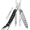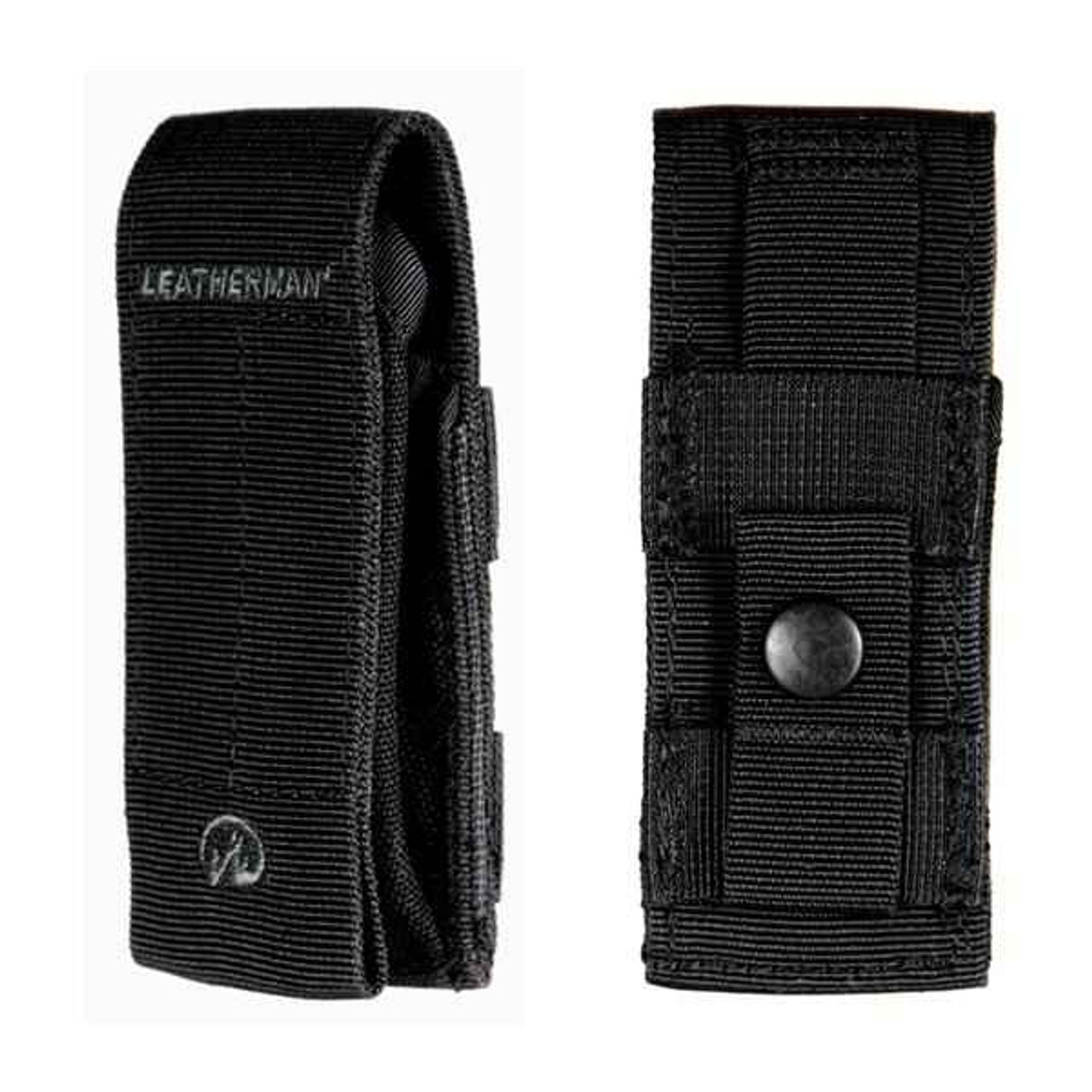This black, nylon MOLLE system sheath features snap webbing strap for attachment on backside. Has gray Leatherman logo and Velcro front closure. Also has a internal panel to store bit sleeve (tight with the 4.5 inch tools).