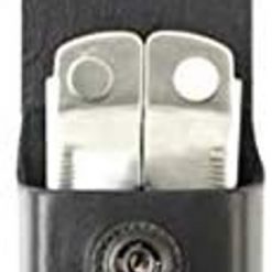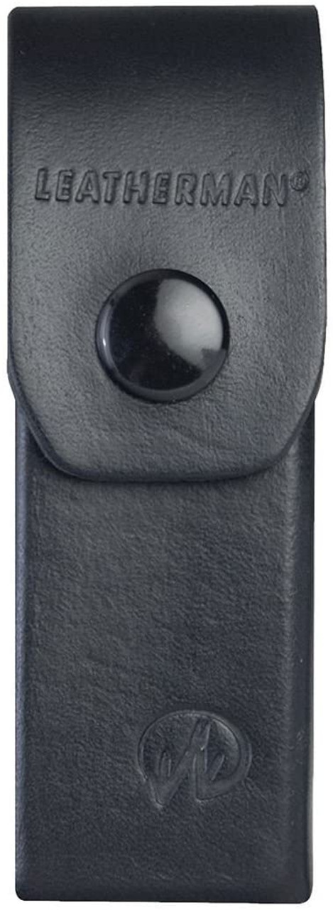 Classic standard leather belt sheath bears the Leatherman name and logo with snap closure.