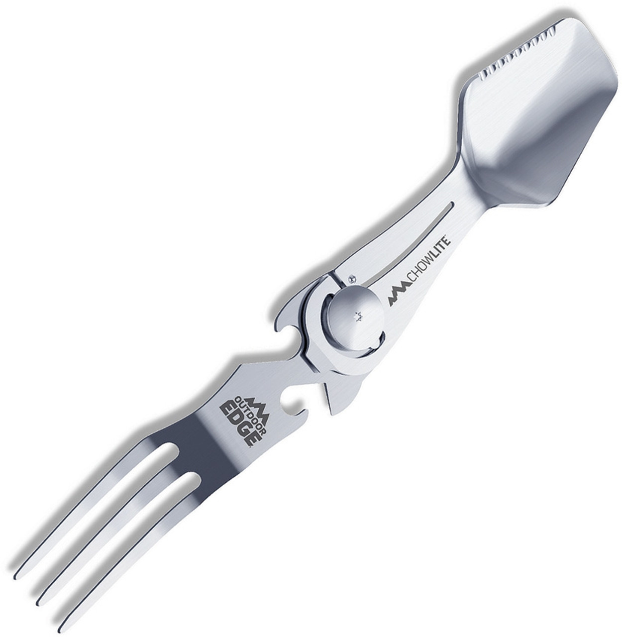 This lightweight stainless steel eating utensil gets the job done while taking up minimal space. The folding design swings open and locks securely, revealing a full size fork and spoon with a serrated food separator, integrated bottle opener, can opener and flathead screwdriver.