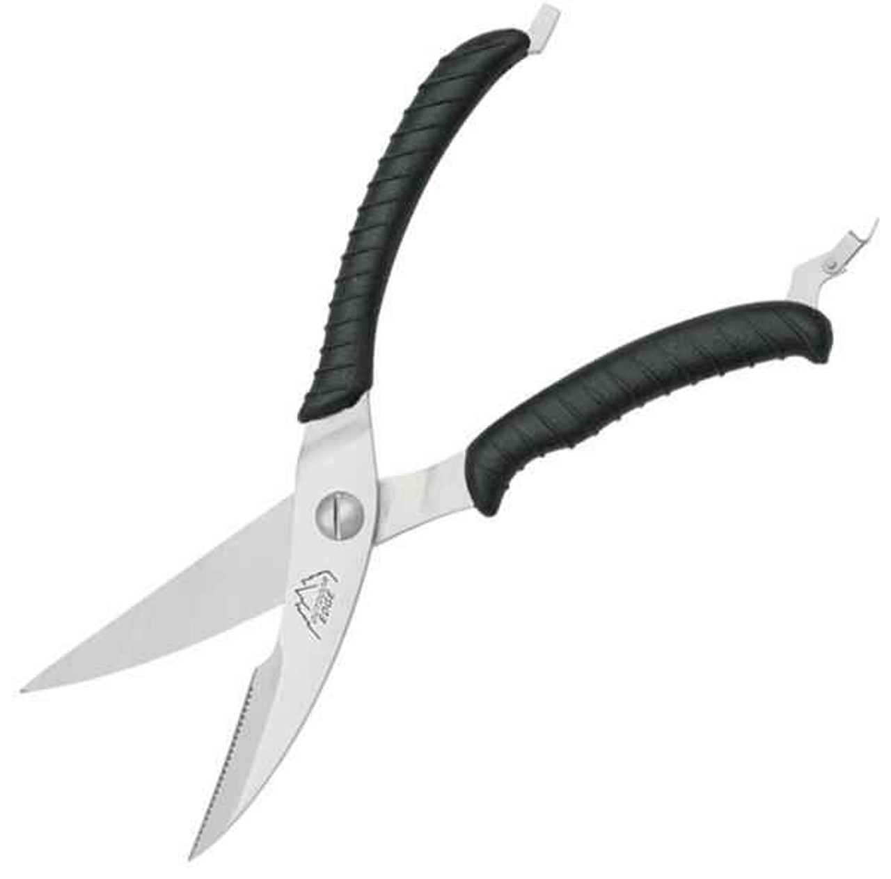 10″ overall. 3 1/2″ partially serrated cutting edge. Full tang 420 stainless construction. Black rubberized Kraton handles. Features spring action and special bone breaking notch. Black nylon belt sheath. Hang packaged.