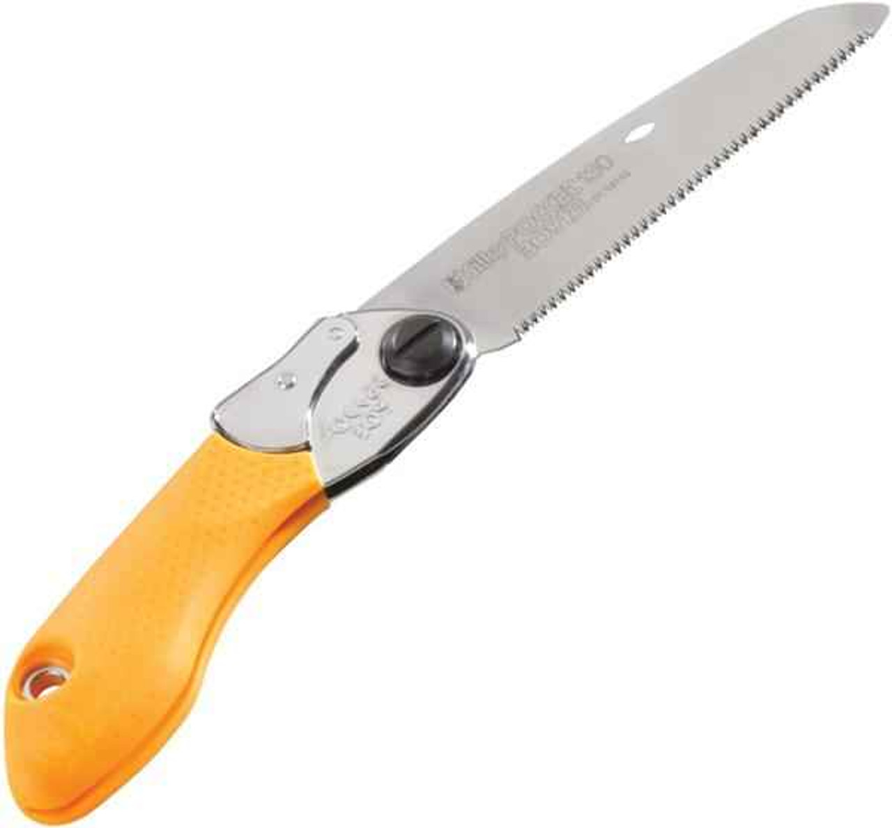 Compact lightweight folding saw with 5-inch blade that will take up very little room in your pocket or backpack. Nicknamed as Little Giant due to its extraordinary cutting capacity. This sleek saw features rust-resistant, hard chrome-plated, taper-ground blade with an impulse-hardened non-set tooth design for greater cutting efficiency. Utilizes proprietary Silky MIRAI-ME (Smooth Cutting) Technology – The Teeth of the Future! The precision-ground, razor sharp blade provide fast, clean and smooth cutting. The blade locks securely into one of two open positions, in line with the handle and flush cutting. The blade resists the effects of tree resin and easily wipes clean. The non-slip rubberized handle provides a sure and comfortable grip even in the most difficult operating conditions. Exceptional design, strength, balance and superior finish quality. Clear plastic flip-lock carrying case with belt clip is included. An ideal saw for your glove box or to carry on hikes. Made in Japan.