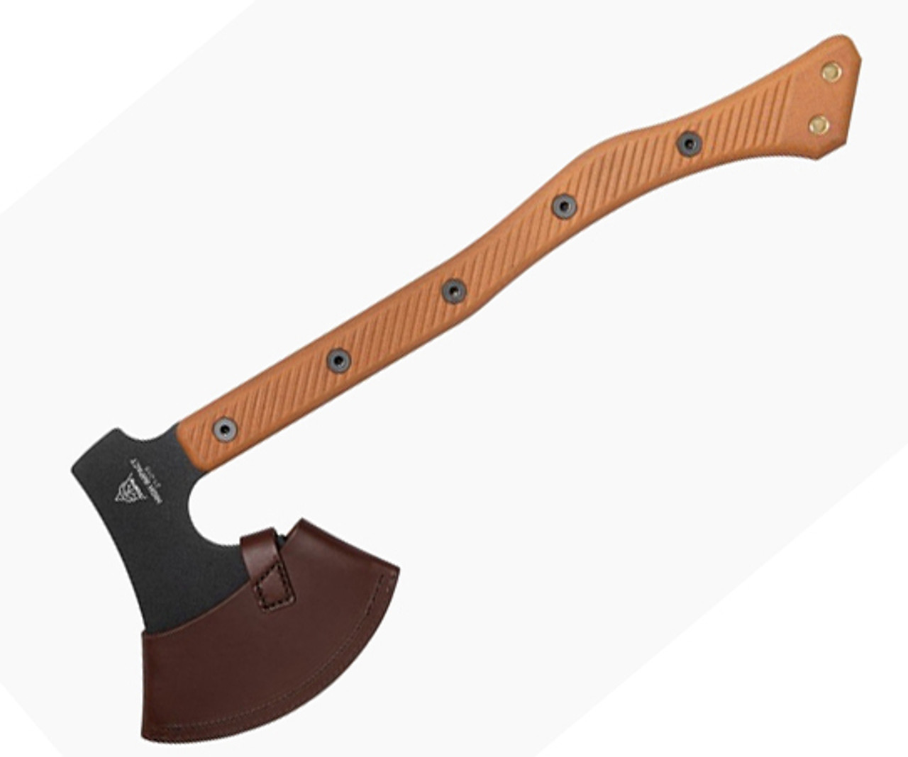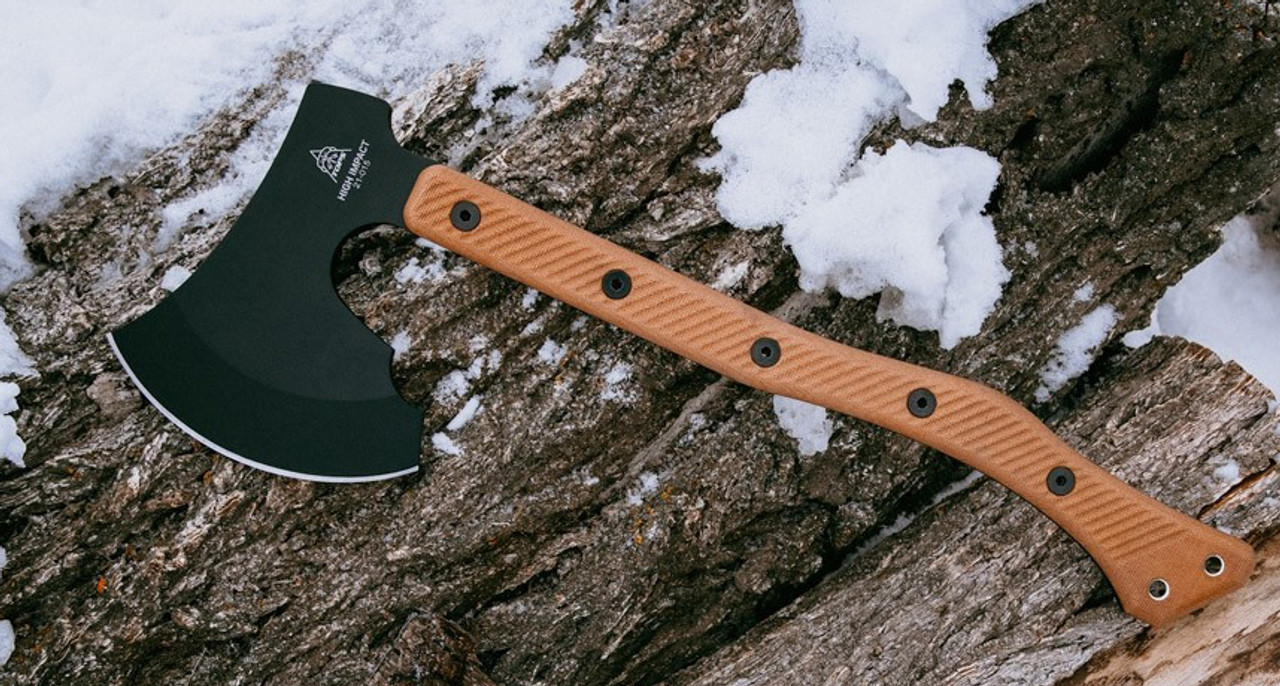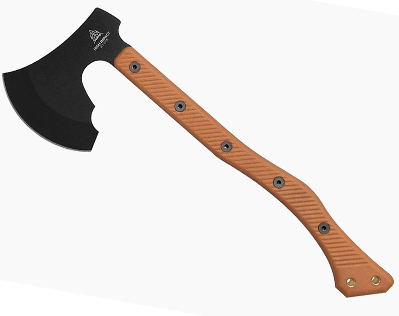 The TOPS High Impact Axe is Leo’s take on a full-sized hatchet/small axe. At just over 20 inches overall length, full-tang, and 3/8” thick, this thing has some weight behind it. It’s made of 1075 high carbon steel, so it’ll handle impacts well and keep a good edge. The tan canvas Micarta handles are thick, but have comfortable, rounded edges with some extra contouring to improve the grip without making it harsh