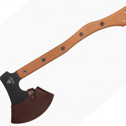 TOPS Knives High Impact Axe HIM-01, 20″ Overall 1075 Black Traction Coated Axe, Tan Canvas Micarta Handle, Brown Leather Sheath