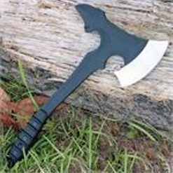 It is made from one solid slab of 5/16” 1075 instead of the usual 1095. This was to provide better impact resistance with only slightly less edge retention. Its large 5.25″ blade will chop through just about anything you put in front of it. The spike on the back is double-edged to provide maximum damage (2.18″ on the top side, 1.88″ on the bottom). The long handle with grippy Black Linen Micarta gives great reach and power with every chop. A high quality black leather sheath is included with two snaps to secure the ax in the sheath. The sheath was designed simply as a blade cover, not as a belt sheath (for safety reasons). There are small loops on the back that can be used to secure it to a pack or other MOLLE gear.